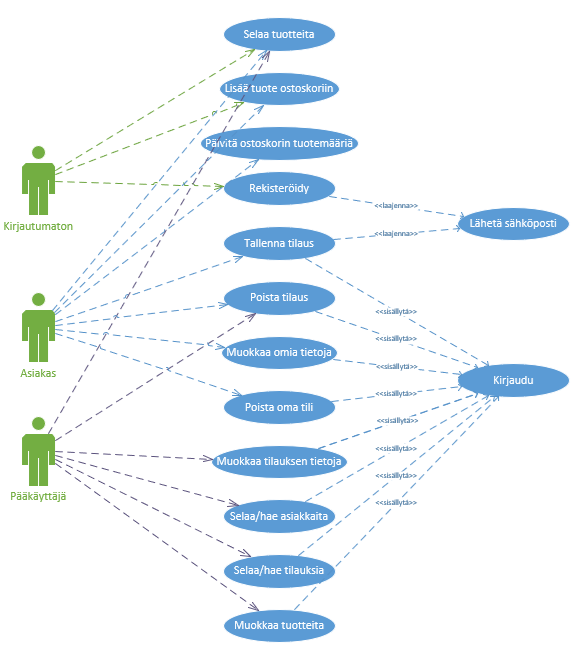 Käyttötapauskaavio kuvaa mitä toimintoja erilaiset käyttäjät voivat sovelluksen avulla tehdä.
