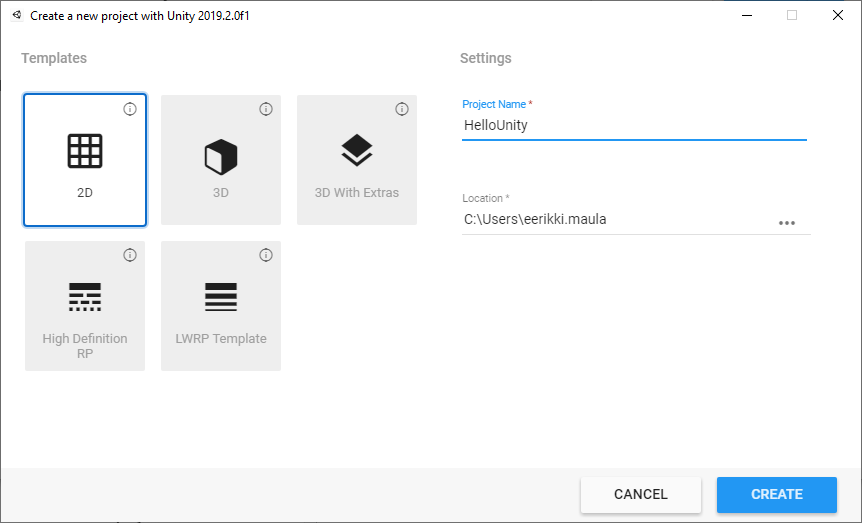 - Valitse New, annetaan projektille nimi (HelloUnity) ja valitaan tyypiksi 2D. Sijainti voi olla C-asemalla tai muistitikullasi.