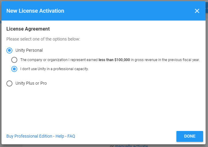 Valitse Activate New License, Unity Personal ja "I don't use Unity in a professional capacity".