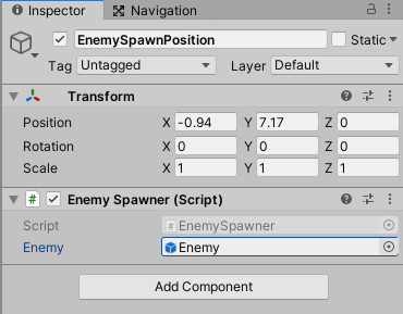 - Raahaa skripti EnemySpawnPosition-objektille.