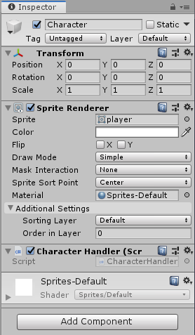 • Nimeä Character, lisää Inspector-ikkunassa uusi Sprite Renderer
