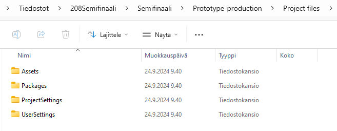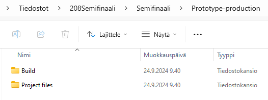 Työ palautetaan GitHub-repossa. Tiedostot jaotellaan kolmeen eri kansioon arviointimoduulien mukaisesti, joka nopeuttaa ja selkeyttää arviointia huomattavasti. Nämä moduulit ovat nimeltään ”Pre-production”, “Prototype-production” ja ”Post-production”. Pelin build ja projektin tiedostot laitetaan omiin kansioihin ”Prototype-production” kansion sisälle.