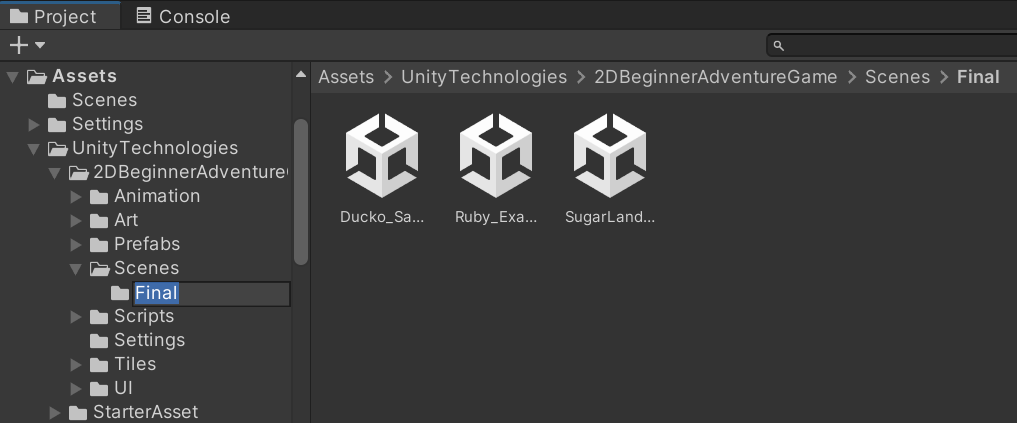 Kun näet kansion UnityTechnologies on materiaali asennettu. Testaa lopullista peliä ja sen jälkeen jatketaan tutoriaalia eteenpäin.
