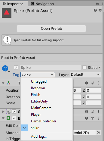 private void OnTriggerEnter2D(Collider2D col) { if (col.gameObject.tag == "spike") { // osuttiin piikkiin - pelin pitäisi päättyä Debug.Log("spike: " + col.gameObject.name); } }Kun pelaaja osuu piikkiin pitäisi pelin päättyä.