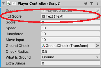 - Raahaa editorissa Text-objekti GameOverScript-skriptin txtScore-muuttujalle arvoksi, silloin koodissa tehty muutos vaikuttaisi juuri tähän käyttöliittymän objektiin.