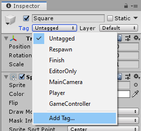 - Lisätään mailalle tagi jotta myöhemmin tiedämme ohjata mailaa koodissa: Inspector-ikkunassa valitse Tag ja Add Tag, anna uudeksi tagiksi "Paddle". Klikkaa uudestaan ja varmista että Tag-kohdassa on nyt Paddle.