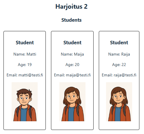 Lisää Student.jsx-tiedostolle komponentti Students. Students saa taulukollisen olioita jotka tulostat Student-komponentin avulla. Lisää css-tyylitiedostoon tyylimäärittely jossa Student-komponentin tiedot näytetään gridin tai flexin avulla.