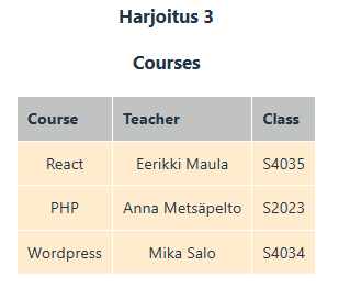 Lisää components-kansioon tiedosto Table.jsx. Toteuta Table-komponentti joka saa parametrina taulukollisen kursseja. Tulosta return-osassa table jossa opiskelijan rivi (tr) luodaan map-funktion sisällä.
