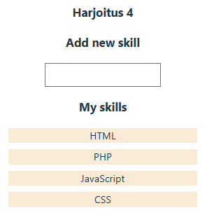 Lisää uusi tiedosto Skills.jsx jossa toteutat komponentin Skills. Tarkoitus on pystyä syöttämään taulukkoon uusia merkkijonoja jotka edustavat oppimiasi taitoja. Tulosta taulukon sisältö map-funktion avulla näkyviin.