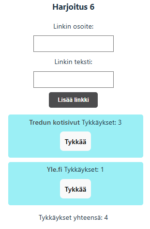Laadi komponentti Links jossa voidaan lisätä uusia link-olioita. Linkillä tulee olla teksti sekä url-osoite. Lisää myös satunnaisluku id-kentäksi.