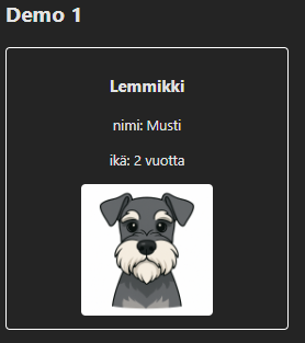 Pet.jsx-tiedostossa parametri propsin avulla voidaan tulostaa lemmikin tiedot: