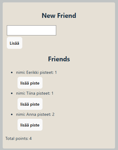 Pisteen lisäämistä varten tarvitaan funktio addPoint. Tilamuuttujaa ei voi muuttaa vaan se täytyy korvata uudella taulukolla. Tästä syystä tehdään aputaulukko tempFriends jossa oikealla id:llä oleva ystävä päivitetään. Lisää addPoint-funktio Friends-komponentille.