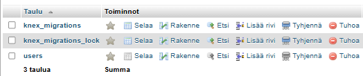 Tietokannassa tulisi nyt olla taulu users sekä migraatioille luodut taulut.