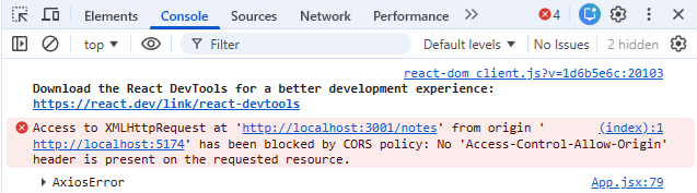 Voit käynnistää nyt notesdemo:n aiemmin tehdyn frontendin. JSON-serverin sijaan tarkoitus on käyttää backendin välittämiä tietoja. Saat kuitenkin konsoliin CORS-virheilmoituksen (Cross-origin resource sharing):