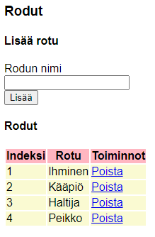 Lisää toiminto rotujen lisäämiselle ja poistamiselle. Näytä rodut taulukossa.