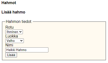 Hahmon lisääminen vaatii lomakkeen jossa haetaan SELECT-ohjaimiin rodut ja luokat. Kannattaa ensimmäisenä pyytää käyttäjältä vain nimi, luokka ja rotu ja testata toimintaa tässä vaiheessa. Käyttäjä voi lisätä tiedot muille kentille (voima, ketteryys jne) tai voit arpoa nämä automaattisesti.