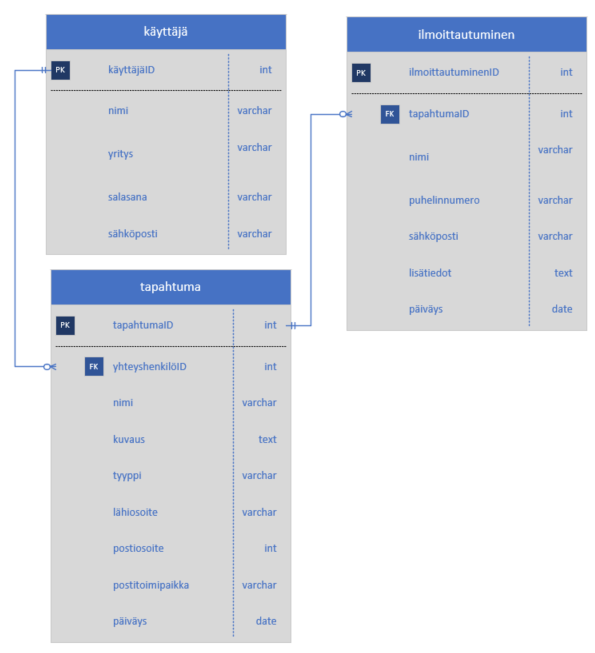 Ilmoittautuessa kirjataan ilmoittautuneelta nimi, puhelinnumero, sähköpostiosoite sekä lisätiedot (vapaa tekstikenttä). Tietokantaan tallennetaan myös ilmoittautumisen päiväys.